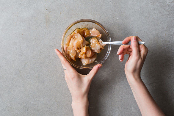 Das Hähnchen mit etwas Küchenkrepp trocken tupfen, in dünne Streifen schneiden und mit der Gewürzmischung und 1–2EL Olivenöl vermengen.
