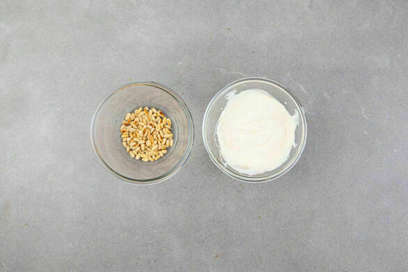 Die Pinienkerne in einer großen Pfanne ohne Zugabe von Fett bei mittlerer Hitze 1–2Min. goldbraun anrösten. Vorsicht, sie können schnell zu dunkel werden. Zum Abkühlen aus der Pfanne nehmen. In derselben Pfanne 1EL Butter schmelzen und 2–3Min. warten, bis die Butter braun wird und ein nussiges Aroma verströmt. Die Butter und den fein gewürfelten Knoblauch unter den Joghurt rühren.