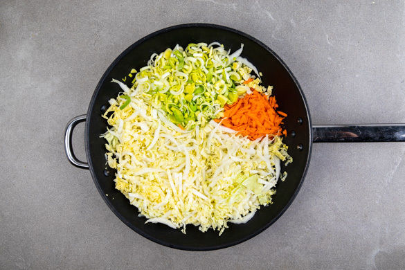 Den Chinakohl, die Karotten und den Lauch in einer großen Pfanne mit 1–2EL Pflanzenöl bei starker Hitze 3–4 Min. scharf anbraten.