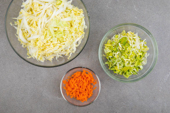 Den Chinakohl längs halbieren und quer in feine Streifen schneiden. Die Karotte schälen und auf der groben Seite einer Küchenreibe raspeln. Den Lauch der Länge nach halbieren und in dünne Streifen schneiden.