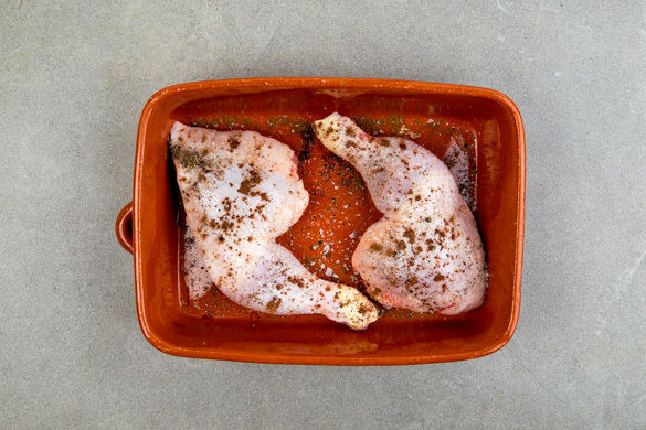 Den Backofen auf 220°C Umluft (240°C Ober-/Unterhitze) vorheizen. Die Hähnchenschenkel trocken tupfen, mit 1–2EL Pflanzenöl, etwas Gewürzmischung sowie Salz und Pfeffer einreiben, mit der Hautseite nach oben in eine Auflaufform geben und im Ofen 30–40Min. backen, bis das Fleisch durch ist. Dabei alle 10Min. wenden.
