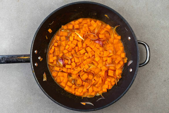 Die Zwiebelstreifen und die Süßkartoffeln in einer mittelgroßen Pfanne mit 2EL Pflanzenöl bei mittlerer Hitze 2–3Min. anbraten, bis die Zwiebeln glasig sind. Mit je ½TL Salz und Pfeffer würzen, dann 100ml Wasser und die restliche Currysauce hinzugeben und aufkochen lassen. Bei mittlerer Hitze 10–12Min. köcheln lassen, bis Süßkartoffeln gar sind.