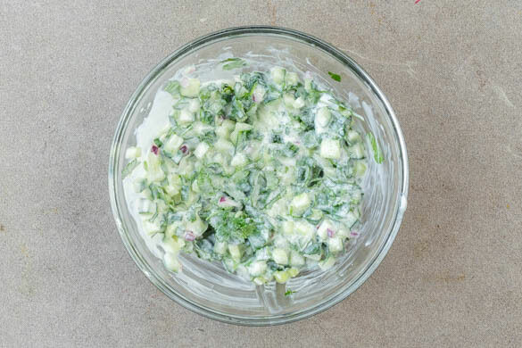 Inzwischen die übrige Zwiebelhälfte fein würfeln. Die Minzeblätter von den Stängeln zupfen und grob schneiden. Den Koriander samt Stängeln grob schneiden. Die Gurke längs halbieren, die Kerne mit einem Löffel entfernen und die Gurke in ca. 0,5cm kleine Würfel schneiden.
