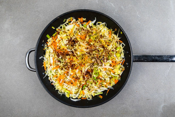 Den Chinakohl, die Karotten und den Lauch in einer großen Pfanne mit 1–2EL Pflanzenöl bei starker Hitze 3–4 Min. scharf anbraten.
