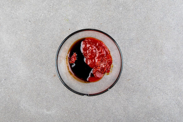 Den Tomatenketchup mit der Teriyakisauce verrühren und die Gewürzsauce mit dem Sambal Oelek abschmecken.