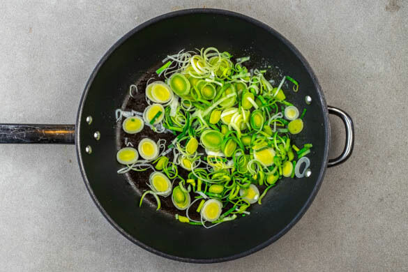 Für die Pasta in einem mittelgroßen Topf 750ml Wasser mit der ½ des Brühgewürzes zum Kochen bringen. Den Lauch in einer mittelgroßen Pfanne mit 1EL Olivenöl und 1 kräftigen Prise Salz bei mittlerer bis starker Hitze in ca. 3Min. glasig anbraten.
