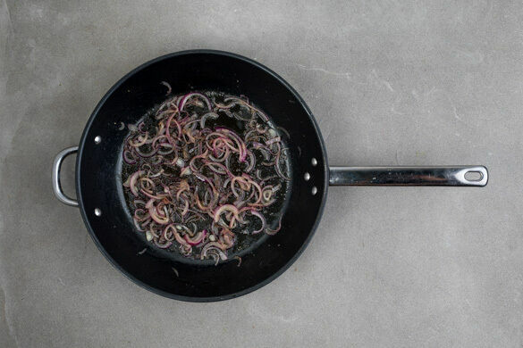 Die Zwiebel schälen, halbieren und in feine Streifen schneiden. Den Knoblauch schälen und fein würfeln. Die Zwiebeln in einer großen Pfanne mit 2EL Olivenöl und 1 Prise Salz bei mittlerer Hitze 2–3Min. glasig anbraten. Das Brühgewürz in 1,5L heißem Wasser auflösen.