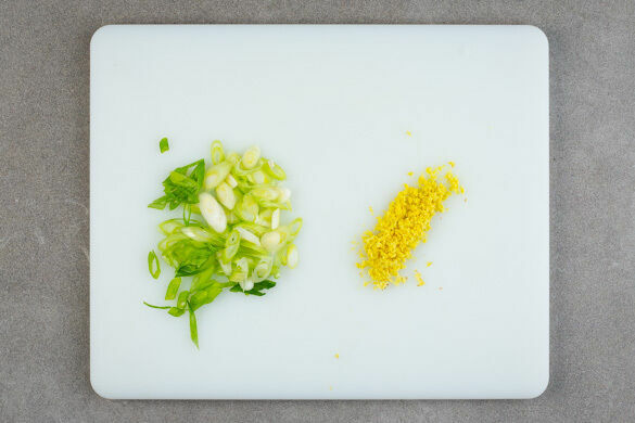 Die Lauchzwiebel in feine Ringe schneiden. Die ½ des Ingwers oder mehr schälen und fein reiben.
