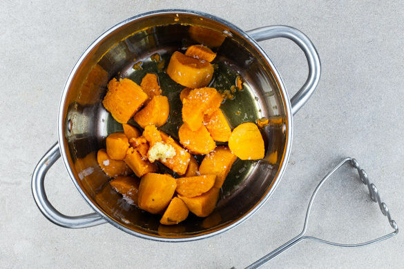 In einem mittelgroßen Topf ausreichend gesalzenes Wasser für die Süßkartoffel zum Kochen bringen. Die Süßkartoffel schälen und in 3–4cm große Stücke schneiden. In das kochende Wasser geben und ca. 15Min. kochen lassen, bis die Süßkartoffeln weich sind. In ein Sieb abgießen, kurz ausdampfen lassen und zurück in den Topf geben.