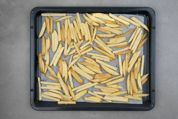 Den Backofen auf 250°C (230°C Umluft) vorheizen. Die Kartoffeln samt Schale in pommesartige Stifte schneiden, auf einem mit Backpapier ausgelegten Backblech mit 2EL Olivenöl, ½TL Salz und 1 kräftigen Prise Pfeffer vermengen und 25–30Min. im Ofen backen, bis die Pommes knusprig und leicht gebräunt sind. Nach der Hälfte der Zeit wenden.