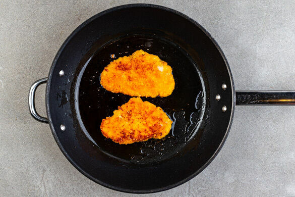 Die Hähnchenschnitzel in einer mittelgroßen Pfanne mit 1EL Pflanzenöl bei mittlerer Hitze von jeder Seite 2–3Min. braten, bis sie goldbraun und gar sind.