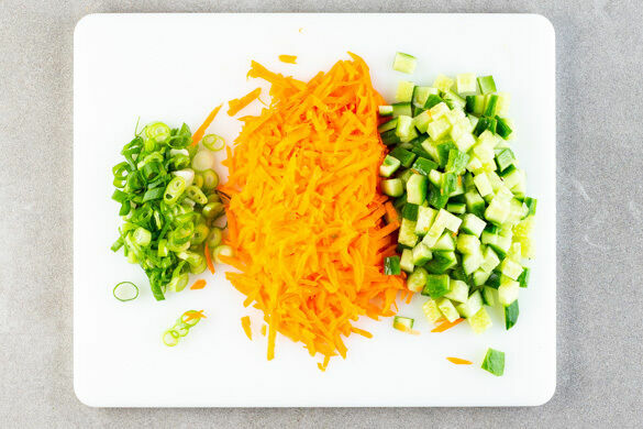 Die Karotte ggf. schälen und mit einer Küchenreibe grob raspeln. Die Gurke längs vierteln und in ca. 0,5cm kleine Stücke schneiden. Die Lauchzwiebel schräg in feine Ringe schneiden.