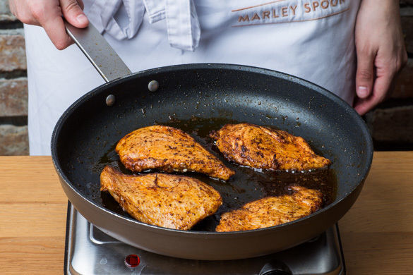 Das Fleisch mit etwas Küchenkrepp trocken tupfen und der Länge nach halbieren, sodass zwei dünne Scheiben entstehen. Das Fleisch mit dem Currypulver und 1EL Pflanzenöl einreiben und in einer mittelgroßen Pfanne bei mittlerer Hitze auf jeder Seite 2–3Min. anbraten. Vom Herd nehmen und ca. 5Min. ruhen lassen.