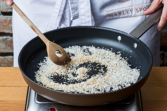 Die Kokosraspel in einer kleinen Pfanne ohne Zugabe von Fett 1–2Min. leicht braun anrösten. Vorsicht, sie können schnell verbrennen. Zum Abkühlen aus der Pfanne nehmen.