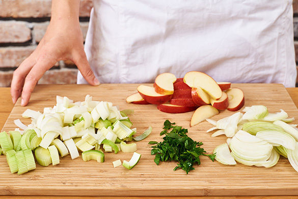 Inzwischen die Lauchzwiebeln längs halbieren und in dünne Streifen schneiden. Die Zwiebeln schälen, halbieren und in feine Streifen schneiden. Den Apfel vierteln, das Kerngehäuse entfernen und den Apfel in dünne Spalten schneiden. Die Petersilie samt Stängeln fein hacken.