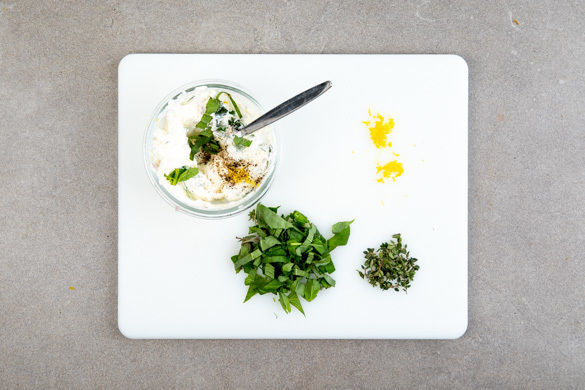 Den Backofen auf 220°C Umluft (240°C Ober-/Unterhitze) vorheizen. Die Schalotte und den Knoblauch schälen und fein hacken. Die Basilikumblätter abzupfen und fein schneiden. Die Thymianblätter abstreifen. Die Zitronenschale abreiben. Den Schmand mit den Schalotten, dem Knoblauch, der Zitronenschale, 2/3 des Basilikums und dem Thymian verrühren.