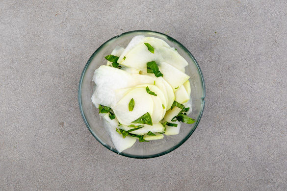 Den Kohlrabi schälen, die hölzernen Enden abschneiden. Mit einer Küchenreibe in feine Scheiben schneiden. Tipp: Für besseren Halt den Kohlrabi zuerst halbieren. Die Kohlrabischeiben mit 1 Prise Salz und 1/2–1EL Essig verrühren. Das restliche Basilikum untermischen.
