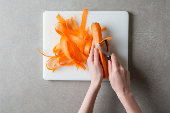 Die Karotte schälen, dann weiter mit dem Sparschäler rundum in langen Streifen abschälen. Die Karottenstreifen mit 1 Prise Salz und ggf. restlicher Gewürzmischung mischen und für die letzten ca. 5Min. zum Gemüse in den Ofen geben und mitbacken.