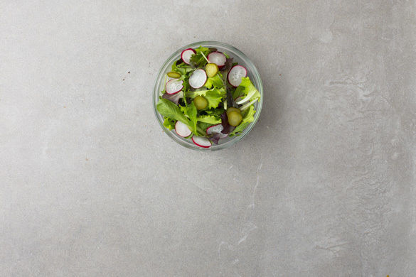 Die Kresse mit einer Schere vom Beet schneiden, die 1/2 der Kresse mit je 1EL Olivenöl und Essig nach Wahl mischen. Die 1/2 der Radieschen putzen und in feine Scheiben schneiden. Tipp: Wer mag, kann auch alle Radieschen verwenden. Die Gewürzgurke ebenfalls in dünne Scheiben schneiden.