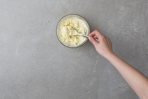Die Eier schälen, mit einer Gabel zerdrücken und mit der Mayonnaisecreme mischen.