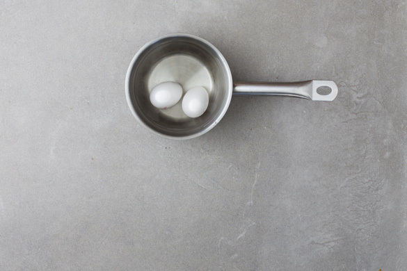 Den Backofen auf 200°C Umluft (220°C Ober-/Unterhitze) vorheizen. In einem mittelgroßen Topf ausreichend Wasser für die Eier zum Kochen bringen. Sobald das Wasser kocht, die Eier hineingeben und in ca. 7Min. hart kochen. Vorsichtig in ein Sieb abgießen und kalt abschrecken.