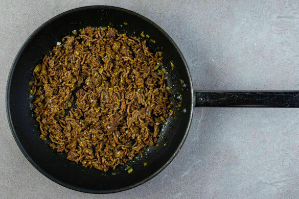 Das Hackfleisch sowie je ½TL Salz und Pfeffer hinzufügen und bei starker Hitze ca. 5Min. unter gelegentlichem Rühren braun braten. Das restliche Aprikosenchutney und die getrockneten Aprikosen hinzugeben, ca. 2Min. weiter braten und nach Geschmack mit Salz und Pfeffer würzen.