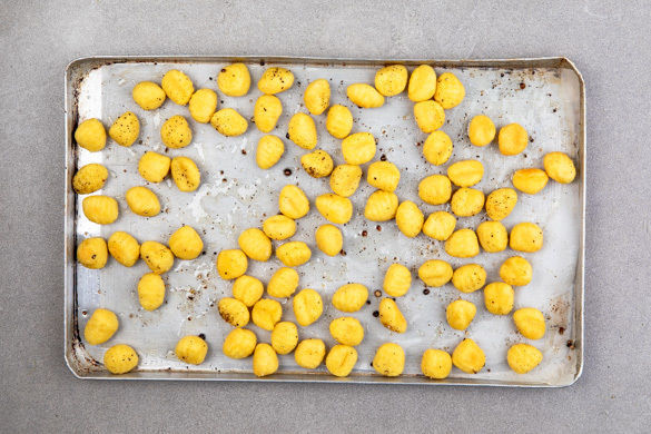 Den Backofen auf 200°C Umluft (220°C Ober-/Unterhitze) vorheizen. Die Gnocchi auf einem mit Backpapier ausgelegten Backblech mit 1–2EL Olivenöl mischen, mit Salz und Pfeffer würzen, gleichmäßig verteilen und 20–25Min. rösten, bis die Gnocchi goldgelb und gar sind.