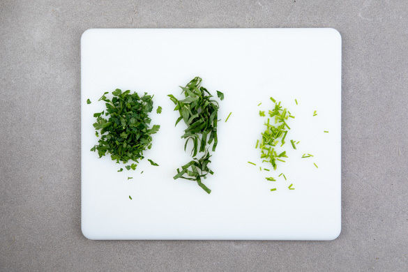 Inzwischen die Basilikumblätter von den Stängeln zupfen und grob hacken. Die Petersilie samt Stängeln ebenfalls grob hacken. Den Schnittlauch in feine Röllchen schneiden.