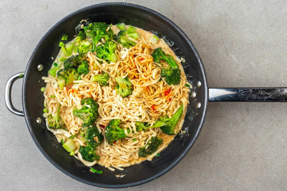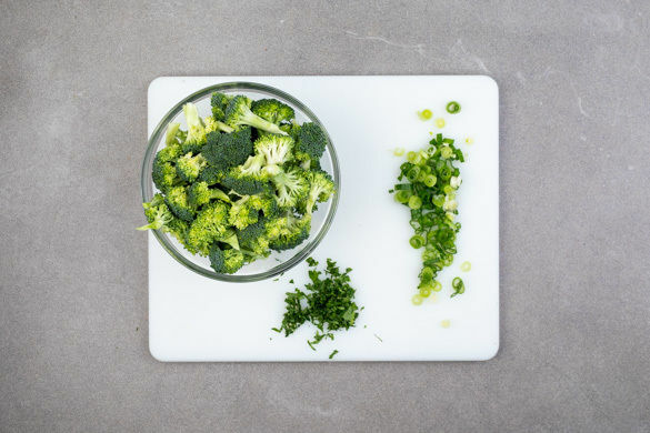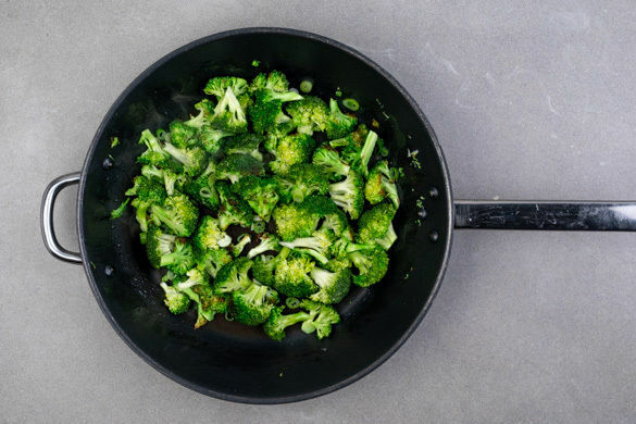 Den Brokkoli in der Pfanne mit 1EL Pflanzenöl bei mittlerer bis starker Hitze 2–3Min. anbraten. Mit 2–4EL Wasser ablöschen und abgedeckt in 3–5Min. bei mittlerer Hitze bissfest garen. Tipp: Wer den Brokkoli etwas weicher mag, gart ihn etwas länger, dann ggf. noch etwas mehr Wasser hinzufügen. Die Lauchzwiebeln zugeben und 1–2Min. mitgaren.