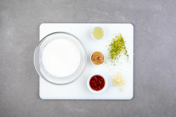 Den Knoblauch schälen und fein würfeln. Die Limettenschale abreiben, dann die Limette halbieren und auspressen. Den Knoblauch mit der Kokosmilch, 1TL Limettenschale, Limettensaft nach Geschmack, der ½ der Sweet-Chili-Sauce, der ½ der Sojasauce, der Erdnussbutter und 50ml Wasser verrühren.