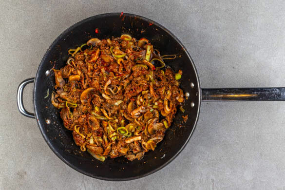 Die Pilze, den Lauch und das Gulasch mit ½TL Salz in einer großen Pfanne mit 2EL Olivenöl bei mittlerer bis starker Hitze unter gelegentlichem Rühren 5–7 Min. braten, bis die Pilze und der Lauch weich sind und das Gulasch gut durchgewärmt ist.