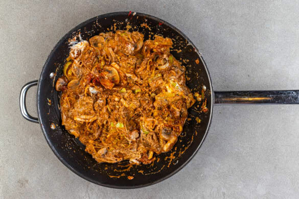 Das Tomatenmark, die Gulaschsauce und die Gewürzmischung in die Pfanne geben, unterrühren und ca. 1Min. mitbraten, bis sich der Duft entfaltet. Dann mit 1EL Essig ablöschen.