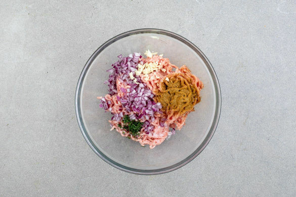 Das Hackfleisch mit den Zwiebelwürfeln, der ½ des Knoblauchs und ca. ⅓ des Dills gut verkneten und mit der Gewürzmischung sowie ½TL Salz würzen. Mit den Händen 10–12 gleich große Hackbällchen formen.