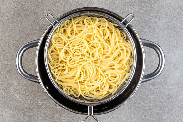 Die Pasta in das kochende Wasser geben und in 7–9Min. bissfest kochen. Mit einer Tasse etwas Pastawasser abschöpfen, dann die Pasta in ein Sieb abgießen und abtropfen lassen. Die Pasta im Sieb z. B. mit einem Teller abdecken, damit sie nicht auskühlt. Den Topf aufbewahren.