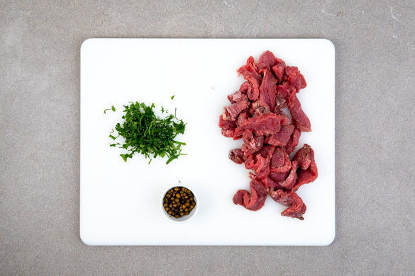 Das Fleisch mit etwas Küchenkrepp trocken tupfen und in 1EL Mehl wenden. Die Pfefferkörner in ein Sieb geben, kurz abspülen und abtropfen lassen. Die Petersilie samt Stängeln fein hacken.