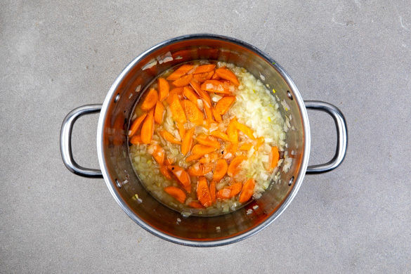 Die 1/2 der Zwiebeln in einem mittelgroßen Topf mit 1EL Pflanzenöl bei mittlerer Hitze 1–2Min. farblos anschwitzen. Die Karotten hinzugeben, mit 1 Prise Salz und 2–3 Prisen Zucker bestreuen und mit 100–150ml Wasser ablöschen. Die Karotten 5–7Min. sanft köcheln lassen, bis sie bissfest sind.