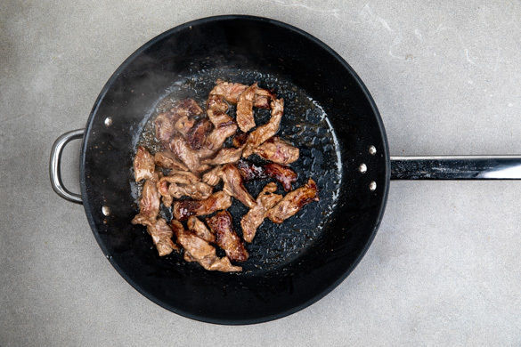 Das Fleisch in einer großen Pfanne mit 1–2EL Pflanzenöl bei starker Hitze 2–3Min. scharf anbraten. Mit Salz und Pfeffer würzen und auf einem Teller beiseitestellen. Die Pfanne nicht auswischen.