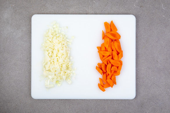 Die Karotten schälen, der Länge nach halbieren und schräg in dünne Scheiben schneiden. Die Zwiebeln schälen, halbieren und in feine Würfel schneiden.