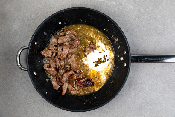 Die restlichen Zwiebeln in derselben Pfanne bei niedriger Hitze 1–2Min. anschwitzen, dann mit 2EL Mehl bestäuben und mit 600ml Wasser ablöschen. Den Brühwürfel hineinbröseln und die Sauce bei mittlerer Hitze 2–3Min. sanft köcheln lassen. Die Crème fraîche unterrühren, das Fleisch und den grünen Pfeffer hinzugeben, alles einmal aufkochen lassen und mit Salz würzen.