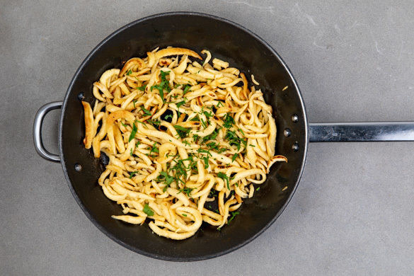 Die Spätzle in einer zweiten großen Pfanne mit 1–2EL Pflanzenöl bei mittlerer Hitze 4–5Min. goldbraun anbraten. Die Petersilie untermischen und die Spätzle mit dem Geschnetzelten und den Karotten anrichten und servieren.