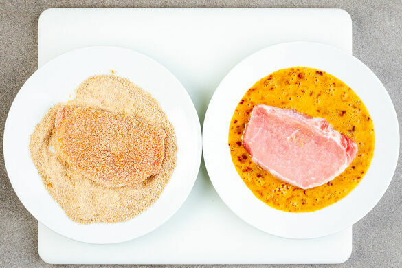 Den Backofen auf 220°C (200°C Umluft) vorheizen. Ein mit Backpapier ausgelegtes Backblech mit 1EL Olivenöl beträufeln und in den Ofen schieben. Das Paprikapulver mit 1 Ei, 1EL Senf und je 1 Prise Salz und Pfeffer auf einem tiefen Teller verrühren. Die Semmelbrösel auf einen zweiten Teller geben. Das Fleisch trocken tupfen, erst in der Eimischung, dann in den Bröseln wenden.