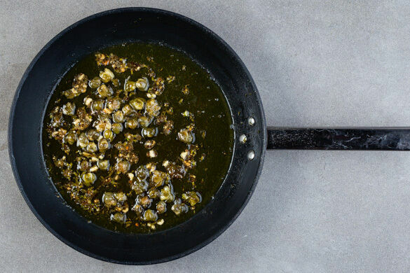 Die Kapern ggf. abtropfen lassen und mit dem Knoblauch in einer kleinen Pfanne mit 1½EL Olivenöl bei mittlerer Hitze ca. 1Min. anbraten. Die Dillstängel, 1EL Zitronensaft, 1EL hellen Essig und 2TL Honig einrühren. Noch ca. 1Min. köcheln lassen, dann vom Herd nehmen und mit Salz und Pfeffer abschmecken.