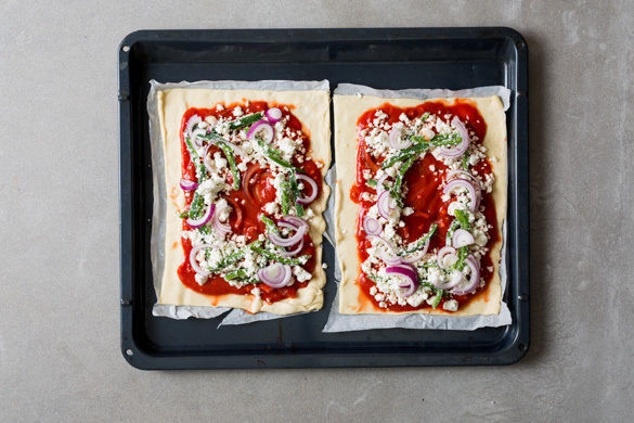Die Tomatensauce nach Geschmack auf den Teigstücken verstreichen, dabei einen kleinen Rand lassen. Mit den Zwiebeln und der Paprika-Feta-Mischung belegen. Auf jedem Teigstück mittig etwas Platz für ein Ei lassen