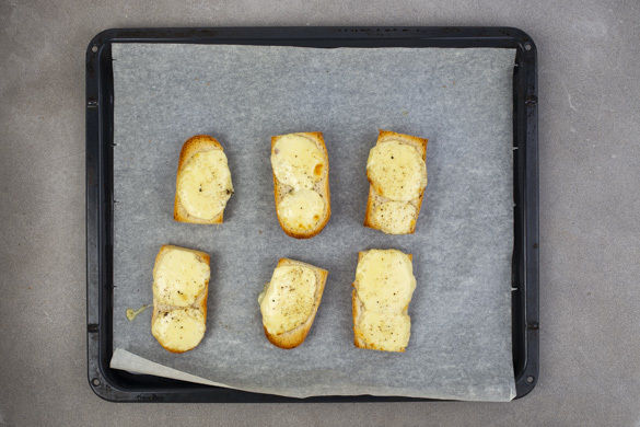 Inzwischen den Mozzarella abtropfen lassen und in dünne Scheiben schneiden. Die Brötchen erst längs aufschneiden, dann jede Hälfte quer halbieren. Die Brötchenstücke gleichmäßig mit Mozzarella belegen, mit etwas Pfeffer würzen und auf einem mit Backpapier belegten Backblech 10–12Min. im Ofen knusprig backen.