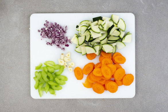 Die Zucchini der Länge nach vierteln und quer in dünne Scheiben schneiden. Die Karotte schälen und in dünne Scheiben schneiden. Den Sellerie quer in dünne Scheiben schneiden. Die Zwiebel schälen, halbieren und in feine Würfel schneiden. Den Knoblauch schälen und halbieren, drei Hälften in dünne Scheiben schneiden, die übrige Hälfte beiseitelegen.