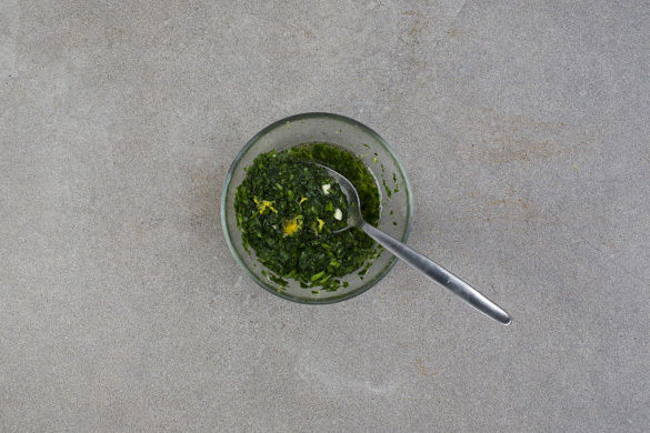 Die Petersilienblätter abzupfen und fein hacken. Den restlichen Knoblauch fein reiben. Ca. 1TL Zitronenschale abreiben, dann die Zitrone halbieren, eine Hälfte auspressen, die andere Hälfte in Spalten schneiden. Die Petersilie mit dem Knoblauch, dem Zitronenabrieb, 1–2EL Zitronensaft, 2EL Olivenöl, 5EL Wasser und 1 Prise Salz verrühren.