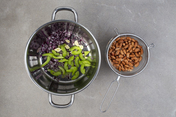 Den Backofen auf 200°C Umluft (220°C Ober-/Unterhitze) vorheizen. Den Sellerie, die Zwiebeln und die Knoblauchscheiben in einem mittelgroßen Topf mit 1–2EL Olivenöl sowie 1 Prise Salz 2–3Min. glasig dünsten. Die Bohnen in ein Sieb abgießen und mit kaltem Wasser abspülen. Die Tomaten in kleine Würfel schneiden, dabei den Strunk entfernen.