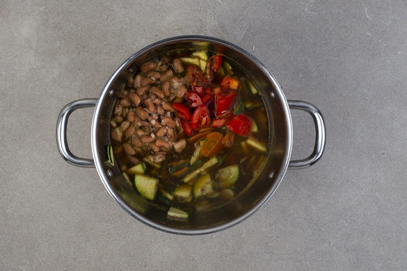Das Gemüse im Topf mit 1,6L Wasser ablöschen, dann 2 gestrichene TL Salz und die Misopaste unterrühren. Die Karotten zugeben und 5Min. köcheln lassen. Die Zucchini zugeben und alles weitere 5Min. köcheln. Die Tomaten und die Bohnen unterrühren und die Minestrone mit der Gewürzmischung abschmecken. Bei niedriger Hitze weitere 5Min. köcheln lassen.