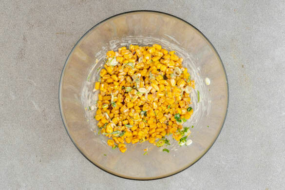 Die Lauchzwiebeln, den Koriander, 3EL Mayonnaise, 1EL Limettensaft und die ½ der Gewürzmischung zu einem Dressing verrühren. Mit Salz und Pfeffer abschmecken, dann den Mais untermengen.