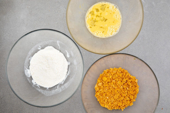 In einer Schüssel oder einem tiefen Teller 3–4EL Speisestärke mit etwas Salz und Pfeffer vermischen. In einer zweiten Schüssel 1Ei verquirlen. In einer dritten Schüssel die Cornflakes mit den Fingern grob zerbröseln. Tipp: Wer mag, kann die Cornflakes auch in einen verschließbaren Plastikbeutel geben und mit einer kleinen Pfanne nicht zu fein zerklopfen.